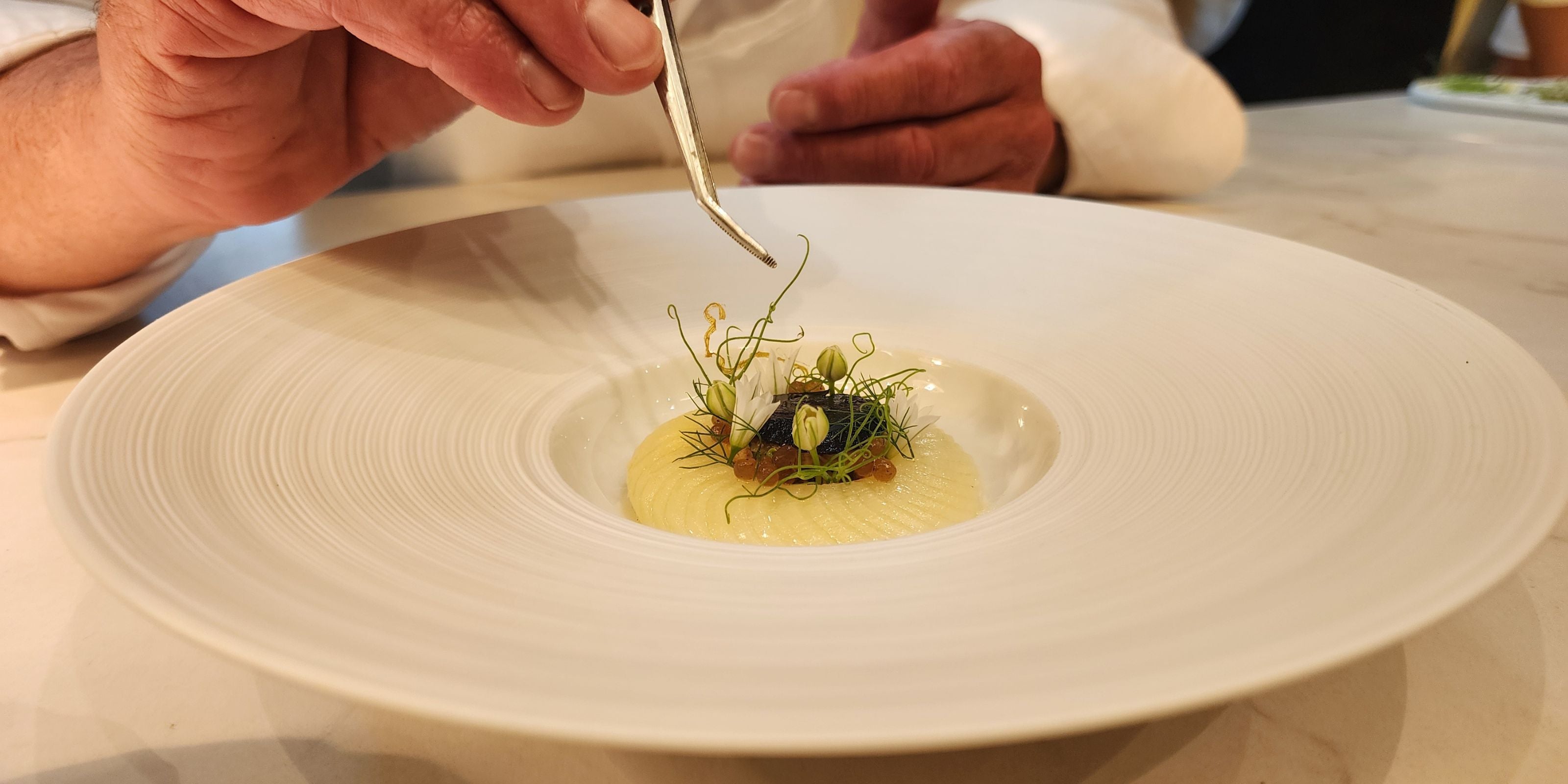 Emiliano Schobert presents his Michelin-starred recipe dedicated to Laumont: guinea fowl with black truffle, white asparagus, and fresh herbs.